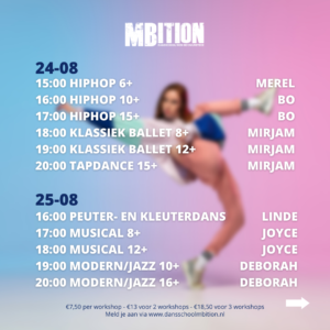 Op woensdag 24 en donderdag 25 augustus organiseren wij dansworkshops! Wil jij een andere dansstijl/les proberen? Wil jij misschien lid worden van MBition? Of wil jij gewoon lekker dansen? Meld je dan aan via de onderstaande knop!