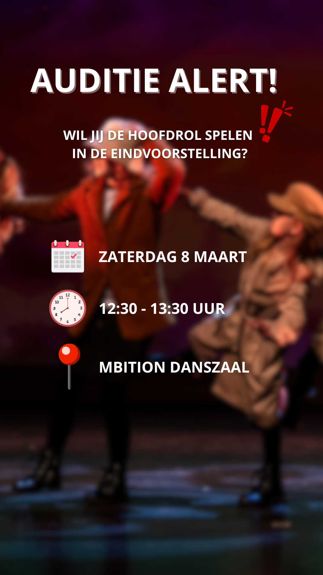 Wil jij de hoofdrol spelen in de eindvoorstelling? Dat kan! Op zaterdag 8 februari organiseren we een auditie van 12:30